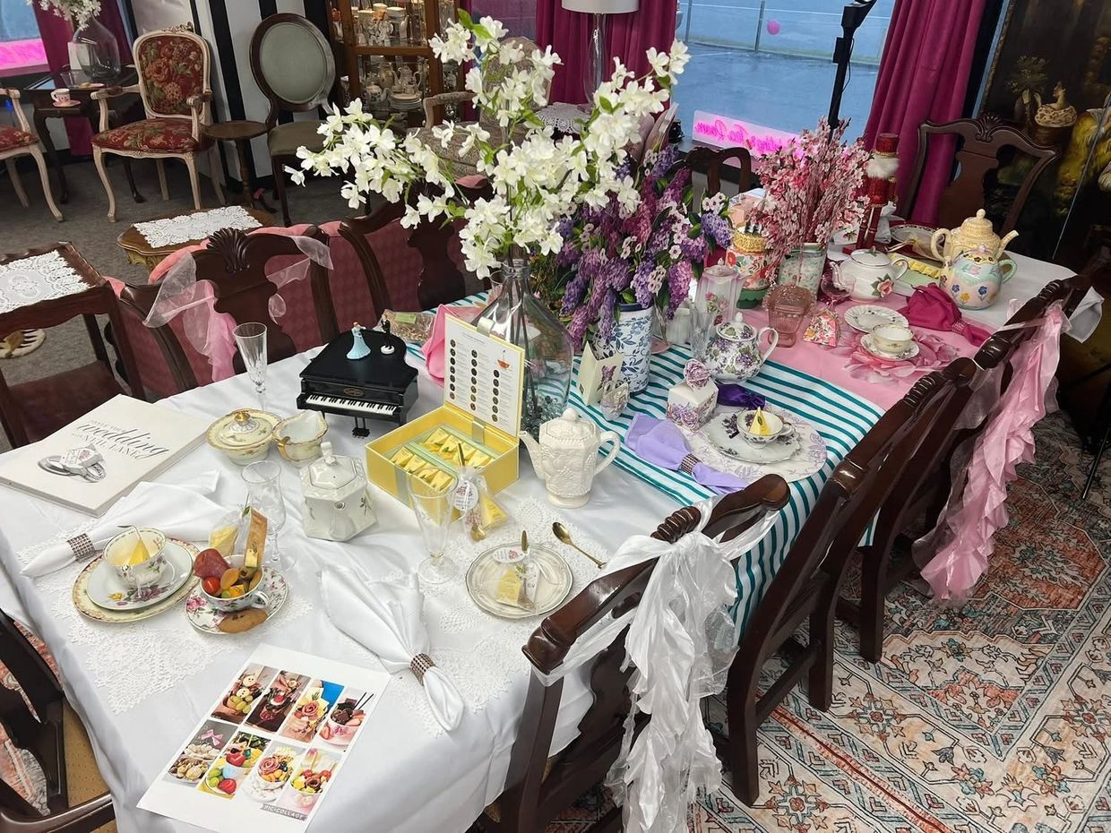 Our Tea Room includes a dinning room table and a parlor that has sofas and chairs to provide extra seating. The table can be set and decorated to host a variety of celebrations!